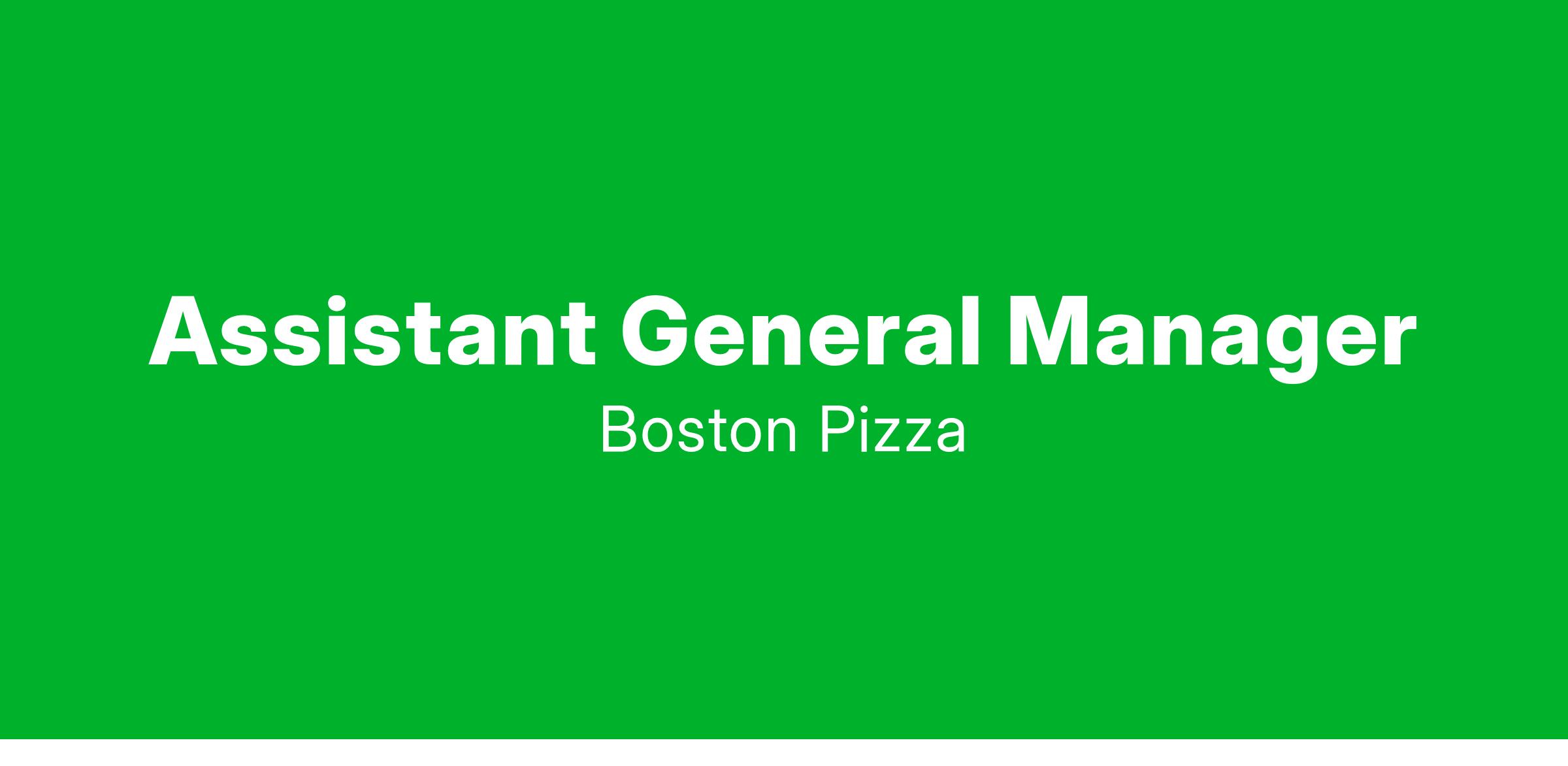 Assistant General Managers at Canada's leading casual dining restaurant, Boston Pizza, oversees the daily operations of the Restaurant. This includes the training, development, staffing, scheduling and performance management of the Front of House team members. The Assistant General Manager is responsible for ensuring that our most important people, our Guests and team members, have an excellent Boston Pizza experience from start to finish. They also demonstrate outstanding leadership abilities, believe in championing a fun and safe work environment and contribute to a thriving workplace culture.