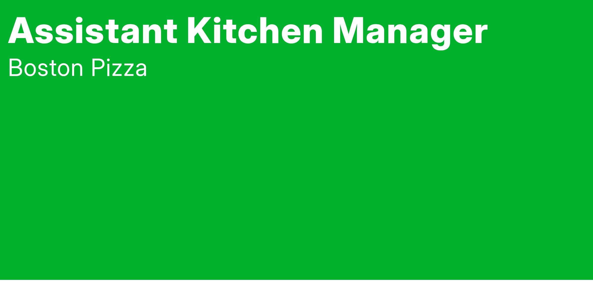 Assistant Kitchen Managers at Canada's leading casual dining restaurant, Boston Pizza, oversee the daily operations of the kitchen, including the training, development and performance management of kitchen employees. They are responsible for ensuring that our most important people, our Guests and team members, have an excellent Boston Pizza experience from start to finish. They also demonstrate outstanding leadership abilities, believe in championing a fun and safe work environment and contribute to a thriving workplace culture. The Assistant Kitchen Manager leads the team during operations focusing on serving perfect food, everytime and to work with a sense of purpose and urgency.