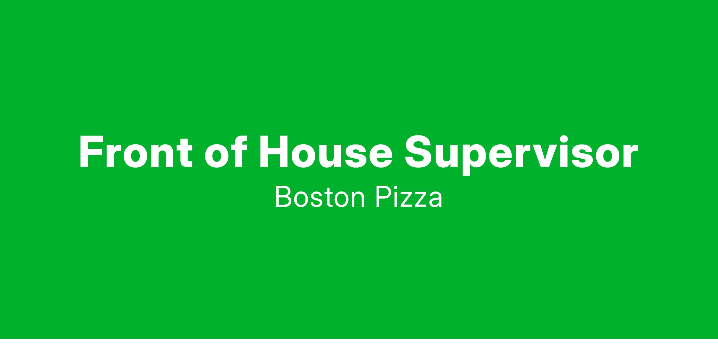 A Front of House Supervisor at Canada's leading casual dining restaurant, Boston Pizza, assists the General Manager with the Restaurant’s daily operations. This includes supporting the training, development, and performance management of the Front of House team members. The Front of House Supervisor supports the team to ensure that our most important people, our Guests, and team members, have an excellent Boston Pizza experience from start to finish. They also demonstrate outstanding leadership abilities, believe in championing a fun and safe work environment, and contribute to thriving workplace culture.