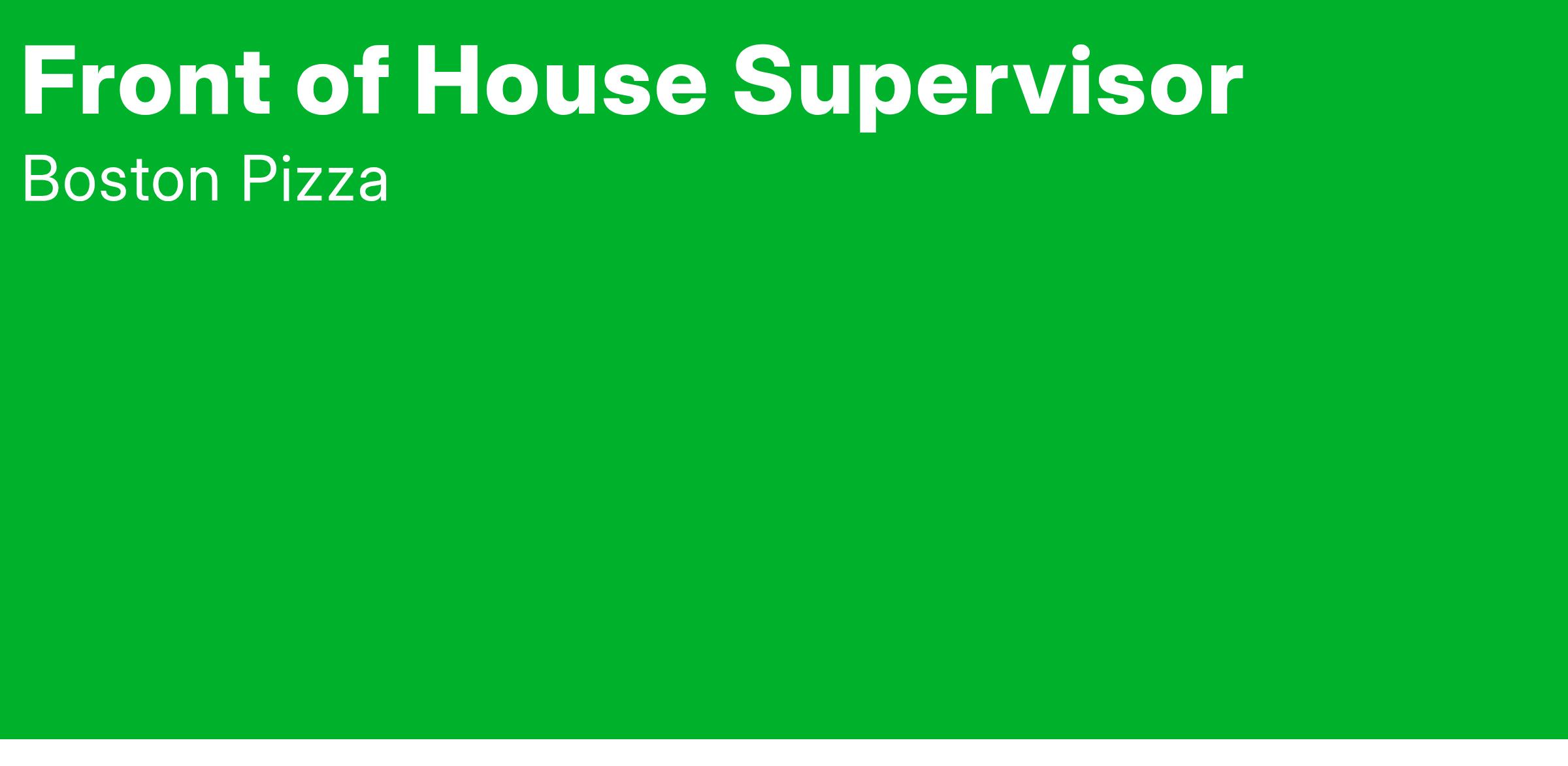 A Front of House Supervisor at Canada's leading casual dining restaurant, Boston Pizza, assists the General Manager with the Restaurant’s daily operations. This includes supporting the training, development, and performance management of the Front of House team members. The Front of House Supervisor supports the team to ensure that our most important people, our Guests, and team members, have an excellent Boston Pizza experience from start to finish. They also demonstrate outstanding leadership abilities, believe in championing a fun and safe work environment, and contribute to thriving workplace culture.