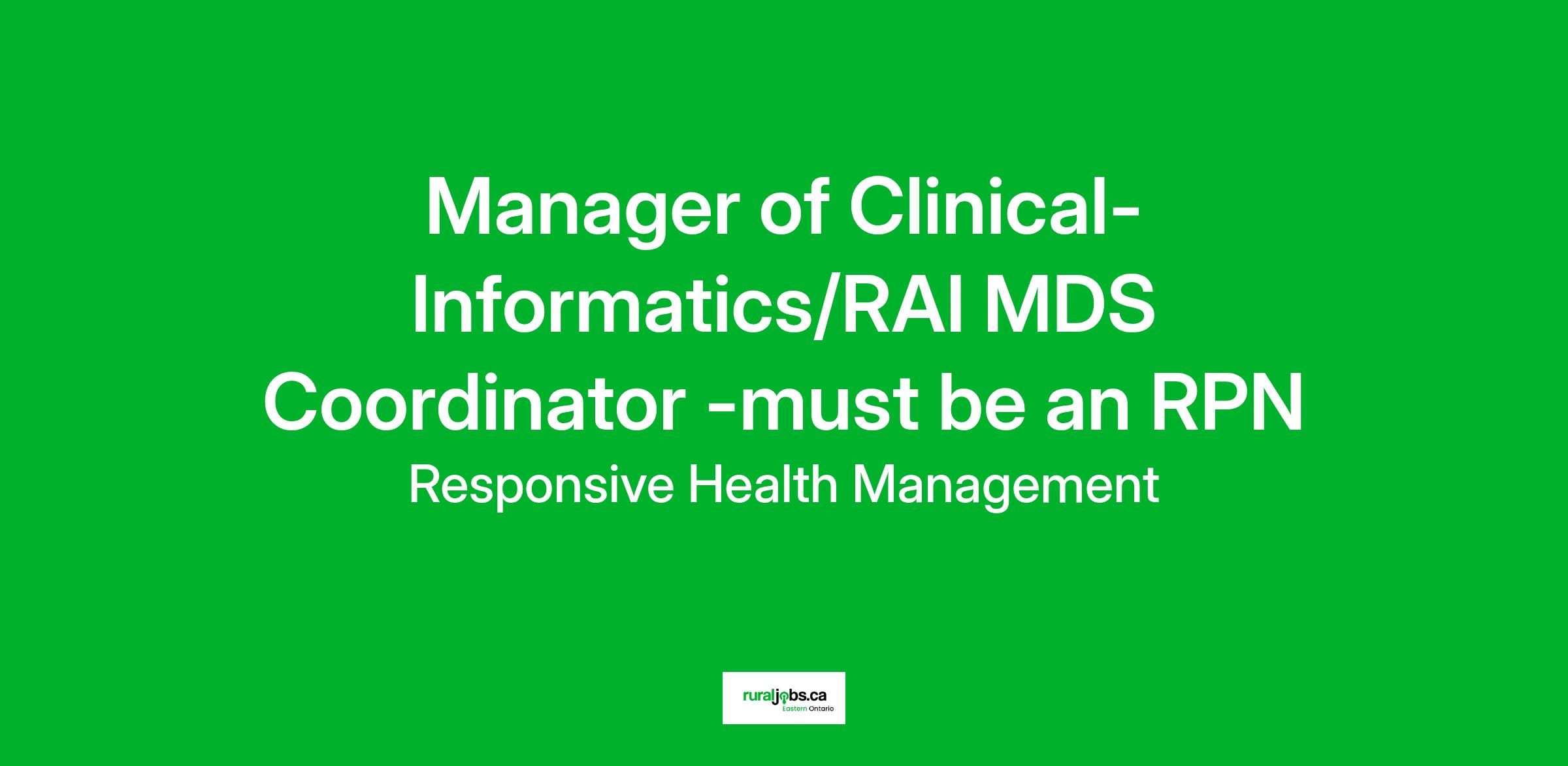 The Manager of Clinical Informatics reports to the Director of Care and manages the information technology and compliance related to resident care through coordinating the RAI-MDS process and monitoring of quality outcomes and CIHI reports. Responsible for the quality of resident care and nursing restorative philosophy and furthermore ensures compliance through coaching, mentoring, and discipline as required. Also, this position is responsible for ensuring staff education, orientation, and mentoring to support the transfer of RAI MDS 2.0 and Quality Improvement knowledge within the home.